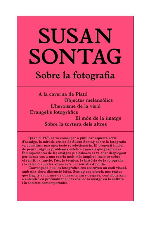 Quan el 1973 es va començar a publicar aquesta sèrie d’assaigs, la mirada crítica de Susan Sontag sobre la fotografia va constituir una aportació revolucionària. El propòsit inicial de pensar alguns problemes estètics i morals que plantejava l’omnipresència de les imatges ja aleshores es va anar desplegant per donar cos a una teoria molt més àmplia i incisiva sobre el sentit, la funció, l’ús, la tècnica, la història de la fotografia, i la relació amb les altres arts i el seu abast polític. Convençuda que les fotografies ens ensenyen un codi visual, amb una clara dimensió ètica, Sontag ens ofereix uns textos que llegits avui, més de quaranta anys després, contribueixen a entendre en profunditat el pes real de la imatge en la cultura i la societat contemporànies. Es tracta d’un llibre clàssic de la història de la crítica d’art i que hem acompanyat de dos textos que va escriure Susan Sontag al final de la seva vida, també sobre fotografia.