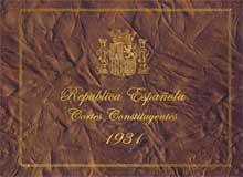 Bellísima edición de la Constitución Española aprobada en 1931 en la que el texto definitivo, acompañado por las diferentes enmiendas propuestas, es enriquecido con numerosas fotografías de los diputados y de los momentos de su proclamación.