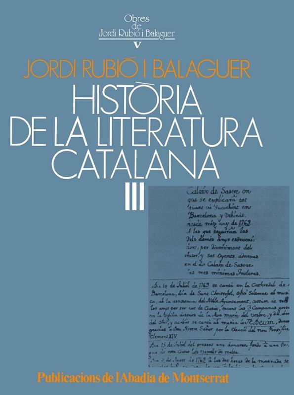 El darrer volum de la magna història de la literatura catalana del doctor Rubió, que conté els excel·lents capítols sobre el segle XVIII apareguts en castellà a la Historia general de las literaturas hispánicas i una bona colla de capítols inèdits sobre el segle XIX i la «Renaixença».
