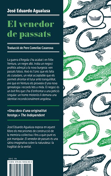 "La guerra d’Angola s’ha acabat i en Félix Ventura, un negre albí, troba un negoci profitós adreçat a la nova burgesia: ven passats falsos. Això és l’únic que els falta als ciutadans, un relat acceptable que els permeti afrontar el futur amb tranquil·litat, així que en Ventura els proveeix d’una nova genealogia i records fets a mida. El negoci és un èxit fins que s’ha d’enfrontar a una petició singular: un home misteriós li demana una identitat incondicionalment angolesa. José Eduardo Agualusa exposa en aquest llibre els mecanismes de construcció de la memòria col·lectiva i fins a quin punt es pot manipular. El venedor de passats és una sàtira imaginativa sobre la naturalesa i la fragilitat de la veritat."