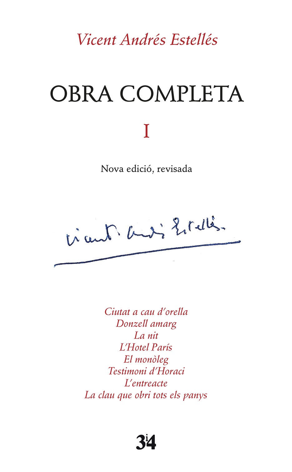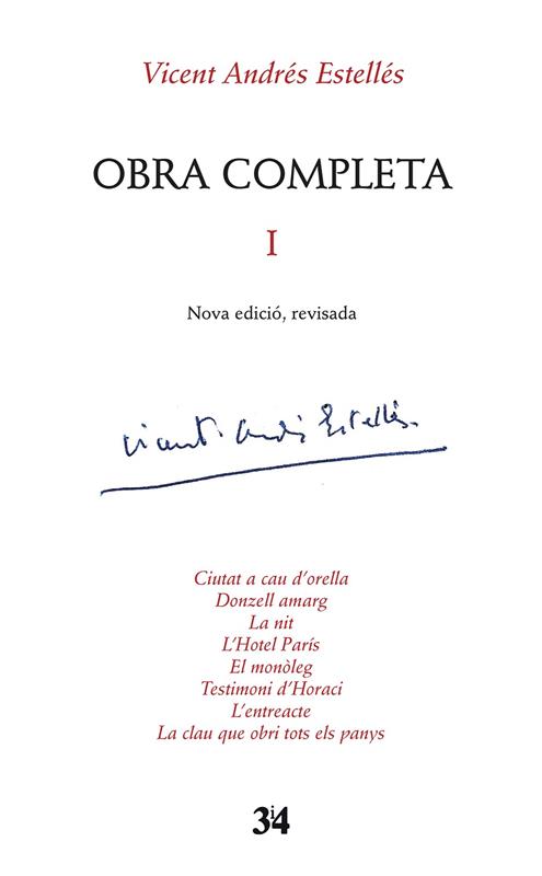 Aquesta Obra Completa -Nova edició, revisada- constitueix un nou projecte d'edició de l'obra estellesiana que conté estudis introductoris, un treball de reorganització cronològica de les obres i d'edició filològica dels poemes estellesians. En aquest primer volum s'apleguen les següents obres: Ciutat a cau d'orella, Donzell amarg, La nit, L'Hotel París, El monòleg, Testimoni d'Horaci, L'entreacte, La clau que obri tots els panys.