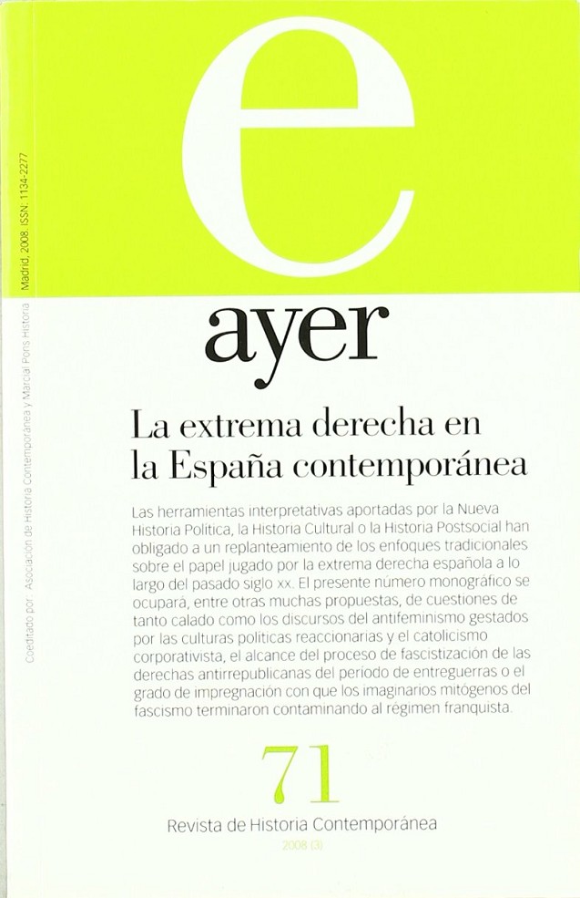Las herramientas interpretativas aportadas por la Nueva Historia Política, La Historia Cultural o la Historia Postsocial ha obligado a un replanteamiento de los enfoques tradicionales sobre el papel jugado por la extrema derecha española a lo largo del pasado siglo XX. El presente número monográfico se ocupará, entre otras muchas propuestas, de cuestiones de tanto calado como los discursos del antifeminismo gestados por las culturas políticas reaccionarias y el catolicismo corporativista, el alcance del proceso de fascistización de las derechas antirrepublicanas del período de entreguerras o el grado de impregnación con que los imaginarios mitógenos del fascismo terminaron contaminando al régimen franquista.